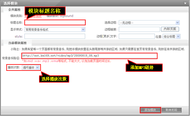 3、输入“模块名称”、“背景音乐路径”,设置“播放次数”后点击“添加模块